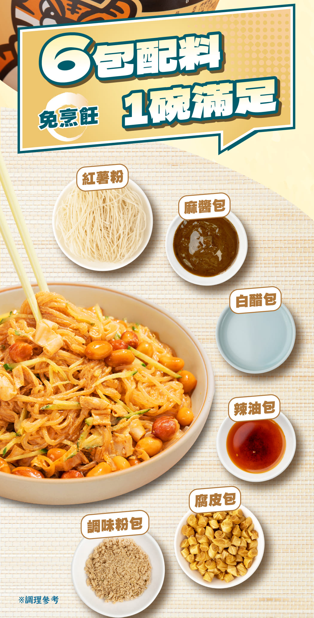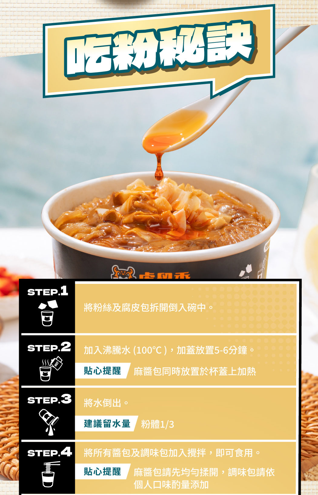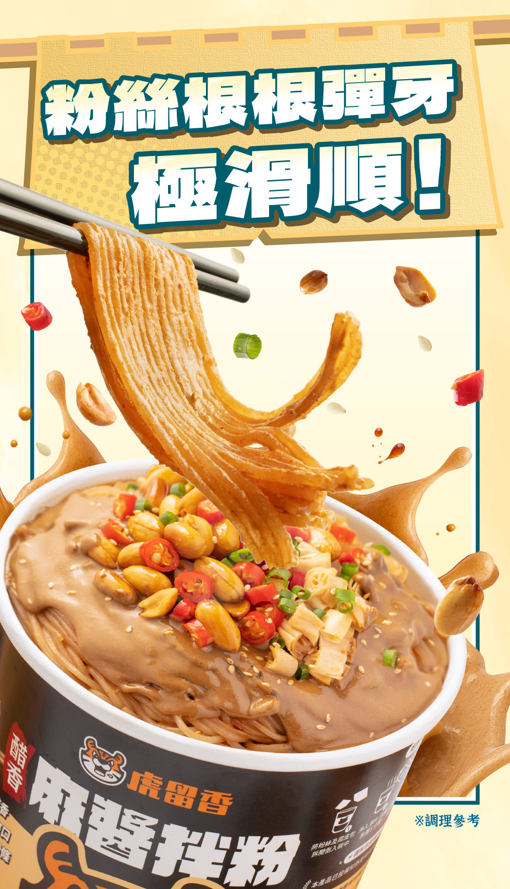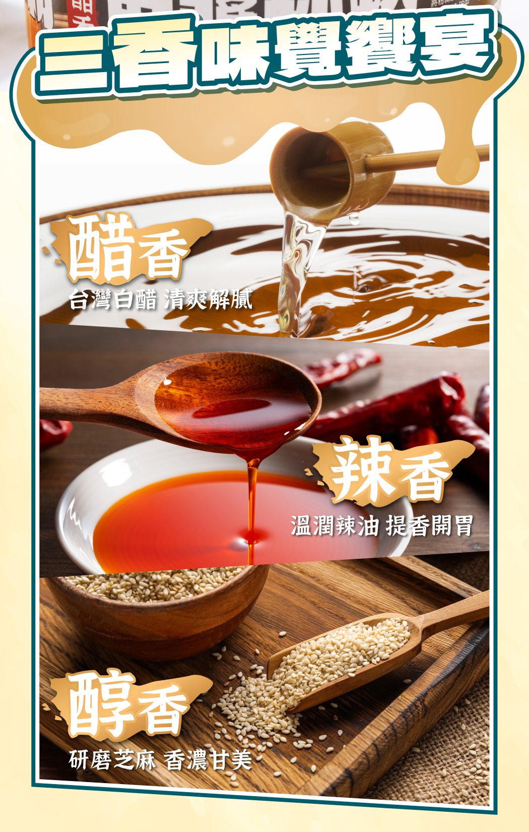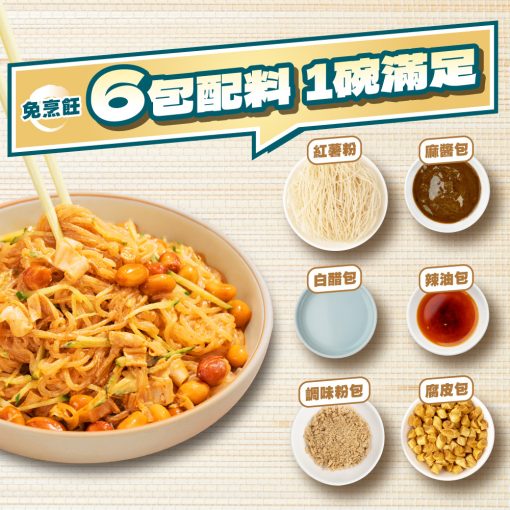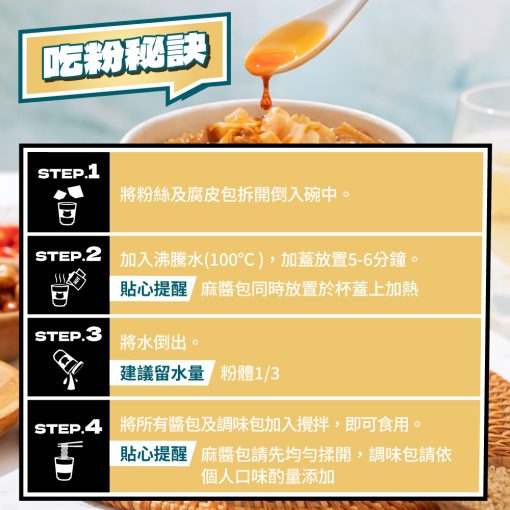 醋香麻醬拌粉,三香饗宴 醇厚爽口! ▸ 白醋香|嚴選台灣白醋,清爽又解膩 ▸ 辣油香|溫潤辣油,提香開胃不灼喉 ▸ 麻醬香|研磨芝麻醇香,唇齒回甘濃香